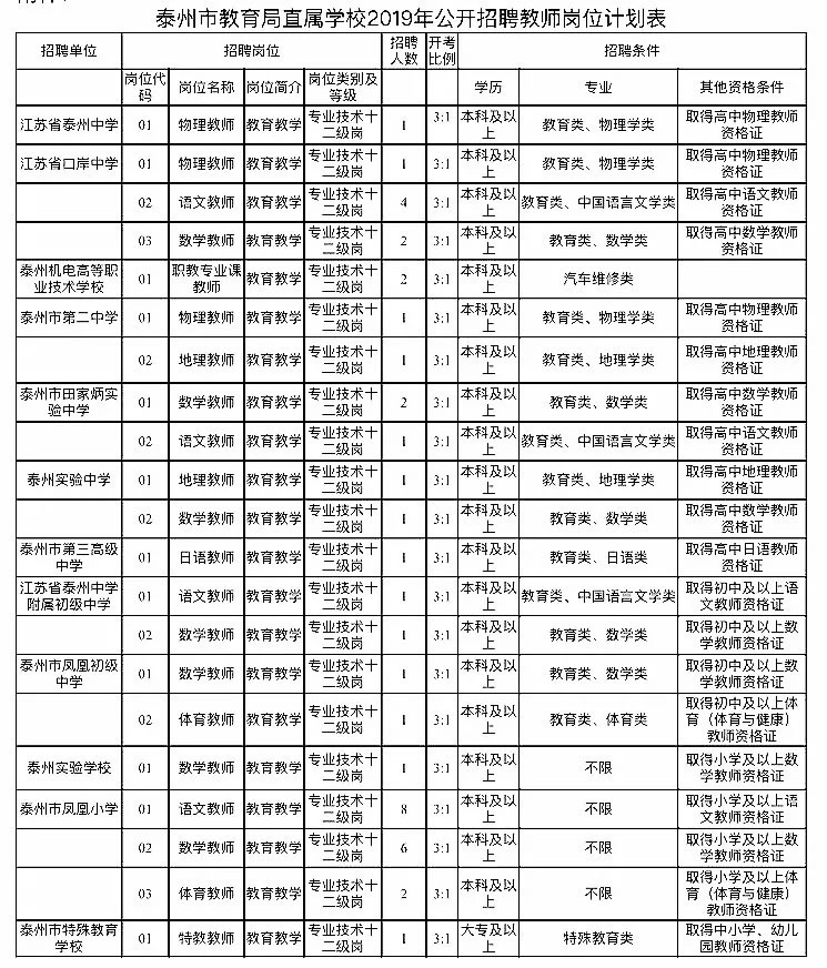 具體招聘崗位、計劃及相關要求詳見《泰州市教育局直屬學校2019年公開招聘教師崗位計劃表》(附件1,以下簡稱《崗位計劃表》)。
