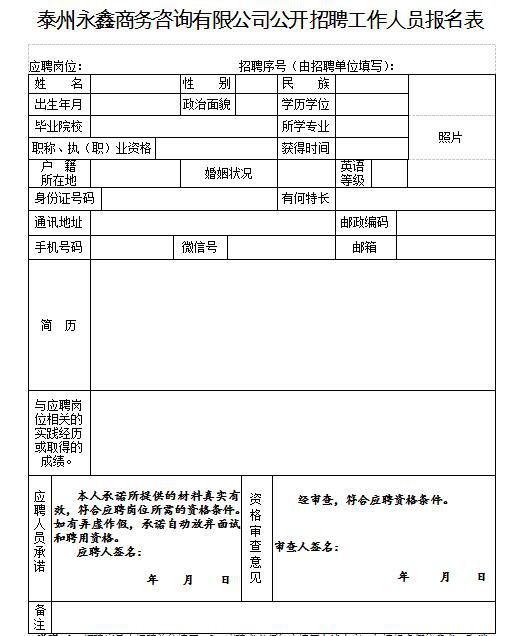 (1)《泰州永鑫商務(wù)咨詢有限公司公開招聘工作人員報(bào)名表》1份;