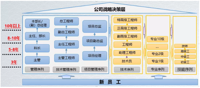 公司設(shè)計“管理、技術(shù)、專業(yè)、技能”四大職業(yè)發(fā)展通道及輪換路徑,以可視化方法實現(xiàn)崗位職責、學(xué)習(xí)要求、能力及績效要求、福利待遇等的顯現(xiàn)化,打造內(nèi)、外職業(yè)生涯相互提升的可視化職業(yè)生涯發(fā)展體系,為員工向上發(fā)展提供“牽引力”;級別調(diào)整帶動薪酬的調(diào)整。